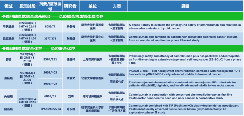 卡瑞利珠单抗联合九游会医药的另一款创新药法米替尼在甲状腺癌和结直肠癌领域有2项研究被接收为壁报,另有卡瑞利珠单抗联合化疗的4项研究在肺癌、结直肠癌、头颈癌和阴茎癌领域的研究被接收为5份壁报。