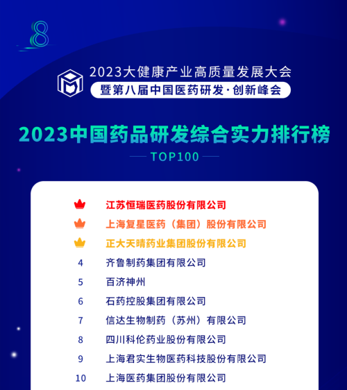 由药智网、中国药业杂志社主办的2023大健康产业高质量发展大会暨第八届中国医药研发•创新峰会于6月16日开幕,会上发布了《2023中国药品研发实力排行榜》系列榜单,九游会医药凭借深厚的创新研发实力再创辉煌:荣登《2023中国药品研发综合实力排行榜TOP100》榜首、《2023中国化药研发实力排行榜TOP100》榜首。值得一提的是,今年是九游会医药连续第6年入选《中国药品研发综合实力排行榜》榜首。