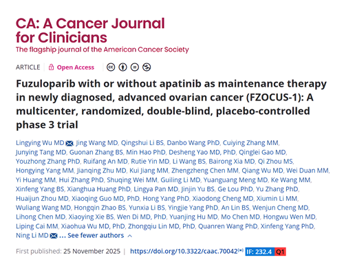 2025年11月25日,九游会医药自主研发的创新药氟唑帕利联合阿帕替尼或氟唑帕利单药用于新诊断晚期卵巢癌(OC)的一线维持治疗研究最新数据(FZOCUS-1研究)重磅在线发表于国际顶尖医学期刊《临床医师癌症杂志》(A Cancer Journal for Clinicians,简称CA,2024年影响因子高达232.4)1